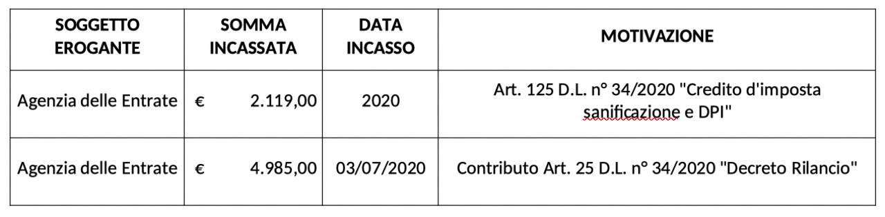 Con riferimento alle informazioni di cui alla legge 124/2017 di seguito si segnala che le informazioni relative agli aiuti e contributi pubblici ricevuti sono riscontrabili sul Registro Nazionale degli aiuti di Stato consultabile al link sotto riportato indicando nella casella codice fiscale il numero 03717480283.